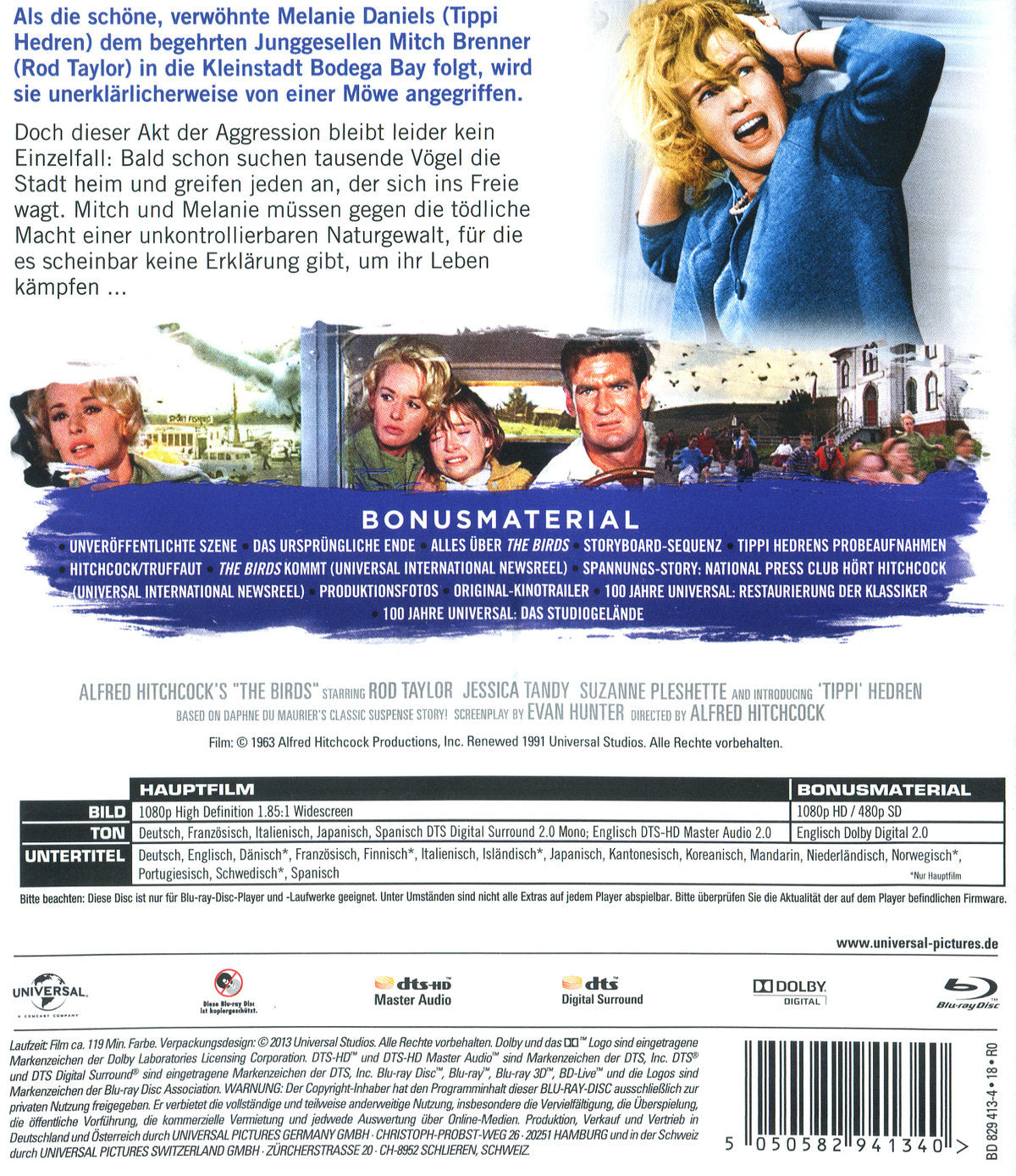 Enthält: Unveröffentlichte Szene; Das ursprüngliche Ende; Alles über "The Birds"; Storyboard-Sequenz; Tippi Hedrens Probeaufnahmen; Hitchcock/Truffaut; "The Birds" kommt; Spannungs-Story: National Press Club hört Hitchcock; Produktionsfotos; Original-Kinotrailer; 100 Jahre Universum: Restaurierung der Klassiker; 100 Jahre Universum: Das Studiogelände;