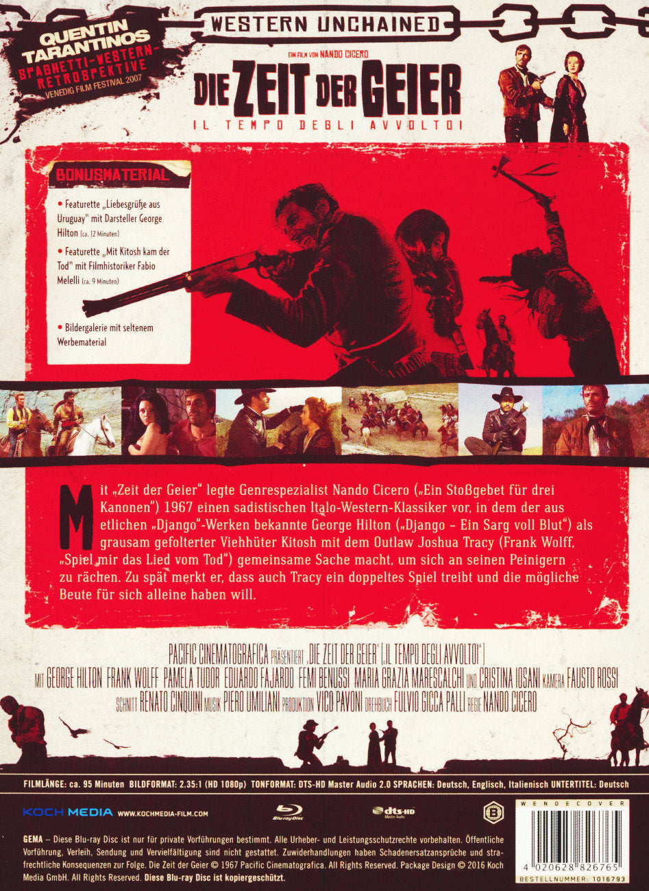 Mit ZEIT DER GEIER legte Genrespezialist Nando Cicero (EIN STOSSGEBET F�R DREI KANONEN) 1967 einen sadistischen Italo-Western-Klassiker vor, in dem der aus etlichen DJANGO-Werken bekannte George Hilton (DJANGO - EIN SARG VOLL BLUT) als grausam gefolterter Viehh�ter Kitosch mit dem Outlaw Joshua Tracy (Frank Wolff, SPIEL MIR DAS LIED VOM TOD) gemeinsame Sache macht, um sich an seine Peiniger zu r�chen. Zu sp�t merkt er, dass auch Tracy ein doppeltes Spiel treibt und die m�gliche Beute f�r sich alleine haben will.