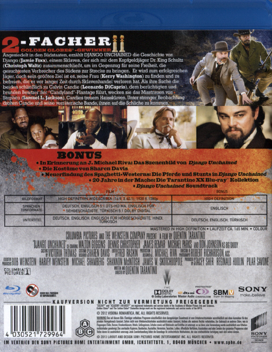 Enthält: In Erinnerung an J. Michael Riva: Das Szenenbild von Django Unchained; Die Kostüme von Sharen Davis; Neuerfindung des Spaghetti-Westerns: Die Pferde und Stunts in Django Unchained; 20 Jahre in der Mache: Die Taranrino XX Blu-ray Kollektion; Django Unchained Soundtrack;