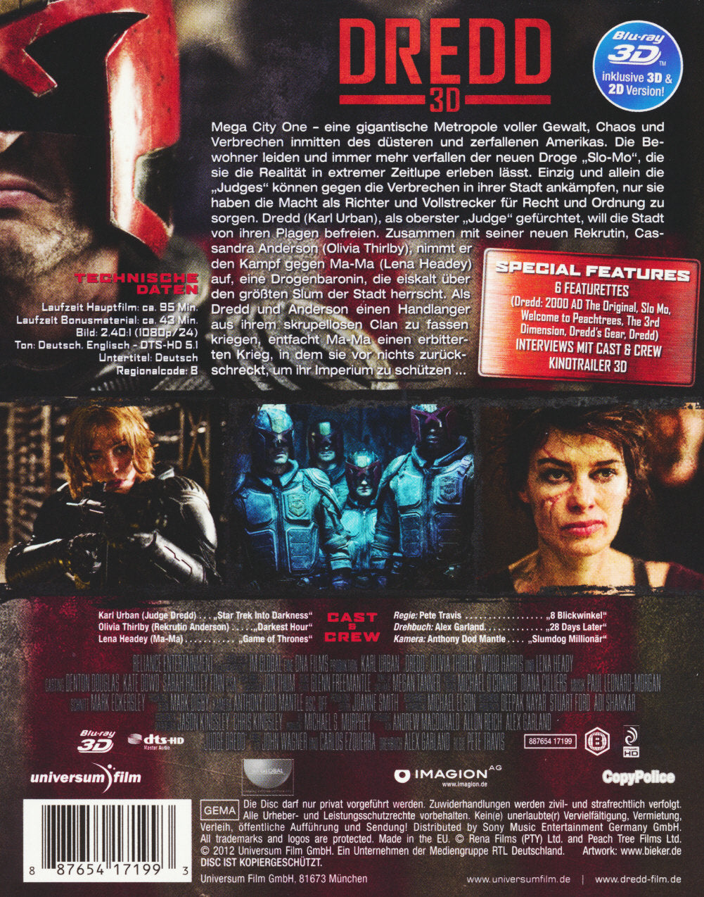 Mega City One - eine gigantische Metropole voller Gewalt, Chaos und Verbrechen inmitten des düsteren und zerfallenen Amerikas. Die Bewohner leiden und immer mehr verfallen der neuen Droge Slo-Mo, die sie die Realität in extremer Zeitlupe erleben lässt. Einzig und allein die "Judges" können gegen die Verbrechen in ihrer Stadt ankämpfen, nur sie haben die Macht als Richter und Vollstrecker für Recht und Ordnung zu sorgen. Dredd, als oberster "Judge" gefürchtet, will die Stadt von ihren Plagen befreien. Zusammen mit seiner neuen Rekrutin, Cassandra Anderson, nimmt er den Kampf gegen Ma-Ma auf, eine Drogenbaronin, die eiskalt über den größten Slum der Stadt herrscht. Als Dredd und Anderson einen Handlanger aus ihrem skrupellosen Clan zu fassen kriegen, entfacht Ma-Ma einen erbitterten Krieg, in dem sie vor nichts zurückschreckt, um ihr Imperium zu schützen. Die Zahl der Todesopfer steigt und auch Dredd und Anderson müssen in diesem erbarmungslosen Kampf an ihr Äußerstes gehen, um am Leben zu bleiben....
