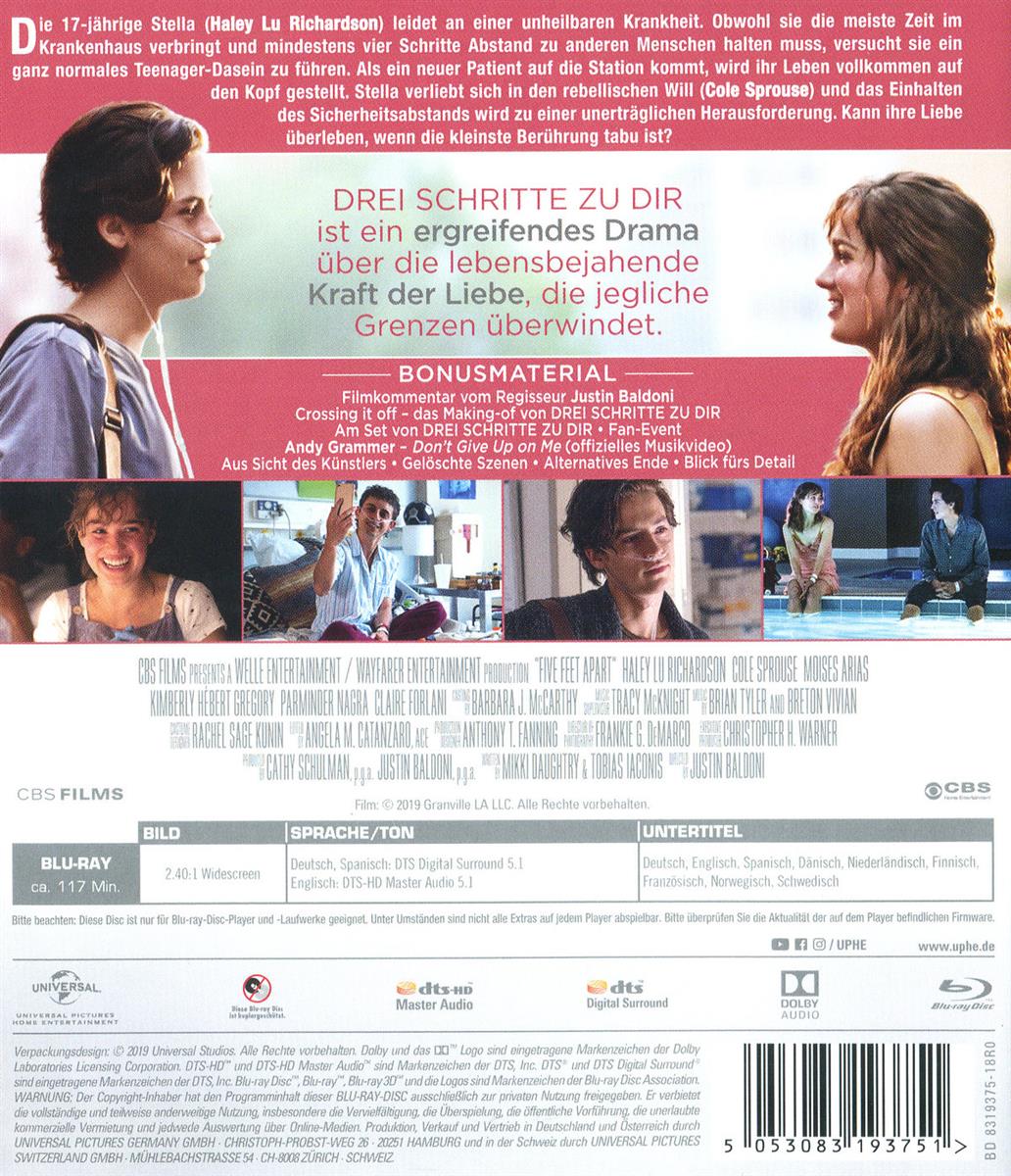 Die 17-j�hrige Stella (Haley Lu Richardson) leidet an einer unheilbaren Krankheit. Obwohl sie die meiste Zeit im Krankenhaus verbringt und mindestens vier Schritte Abstand zu anderen Menschen halten muss, versucht sie ein ganz normales Teenager-Dasein zu f�hren. Als ein neuer Patient auf die Station kommt, wird ihr Leben vollkommen auf den Kopf gestellt. Stella verliebt sich in den rebellischen Will (Cole Sprouse) und das Einhalten des Sicherheitsabstands wird zu einer unertr�glichen Herausforderung. Kann ihre Liebe �berleben, wenn die kleinste Ber�hrung tabu ist?"Drei Schritte zu dir" ist ein ergreifendes Drama �ber die lebensbejahende Kraft der Liebe, die jegliche Grenzen �berwindet.