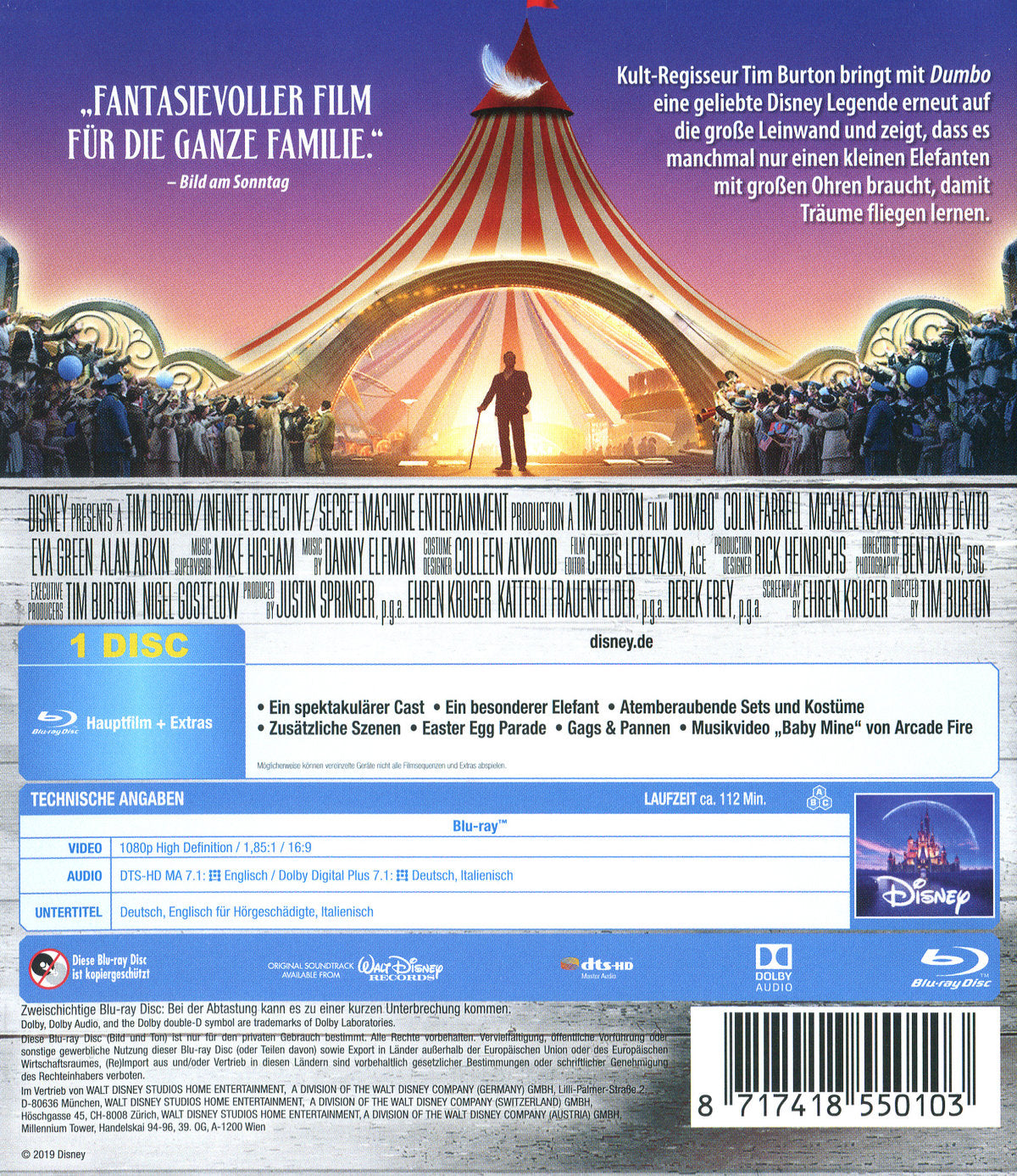 Enthält: Ein spektakulärer Cast; Ein besonderer Elefant; Atemberaubende Sets und Kostüme; Zusätzliche Szenen; Easter Egg Parade; Gags & Pannen; Musikvideo "Baby Mine" von Arcade Fire;