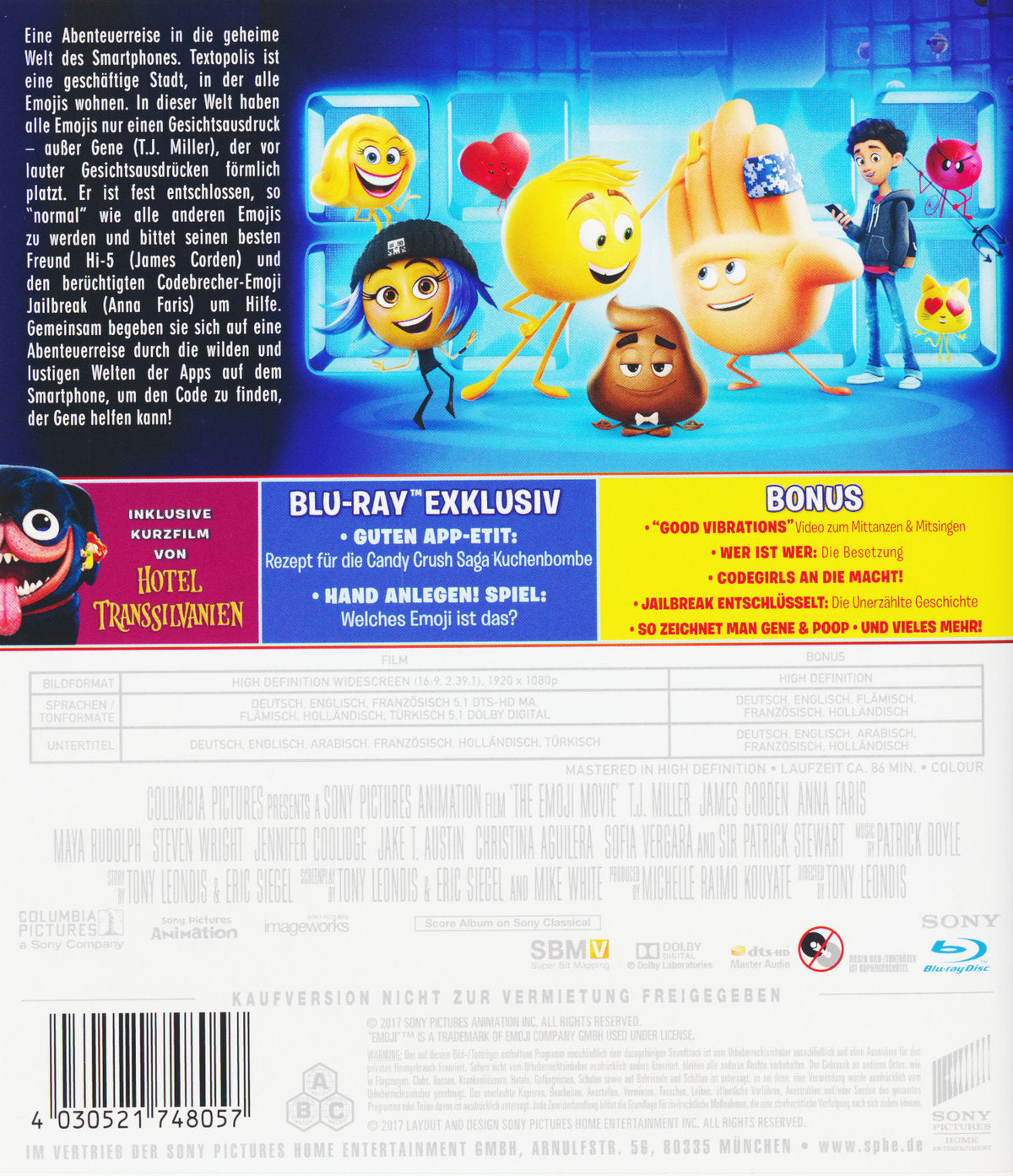EMOJI - DER FILM enthüllt etwas, das noch nie zuvor zu sehen war: Die geheime Welt in einem Smartphone. Versteckt in der Messaging App liegt Textopolis, eine geschäftige Stadt, in der alle Emojis wohnen und darauf hoffen, vom Besitzer des Telefons ausgewählt zu werden. In dieser Welt hat jedes Emoji nur einen Gesichtsausdruck - jedes außer Gene. Denn der ist ein überschwängliches Emoji, das ohne Filter geboren wurde und vor lauter unterschiedlichen Ausdrücken förmlich platzt. Fest entschlossen, so "normal" wie all die anderen Emojis zu werden, holt sich Gene Hilfe von seinem besten Freund Hi-5 und dem berühmt-berüchtigten Codebrecher-Emoji Jailbreak. Gemeinsam brechen sie auf zu einem Abenteuer quer durch alle Apps auf dem Telefon, um den Code zu finden, der Gene reparieren kann. Jede App birgt dabei eine ganz eigene, wilde Welt voller Spaß. Doch plötzlich bedroht eine viel größere Gefahr das Telefon und das Schicksal aller Emojis hängt nun ab von diesen drei so unterschiedlichen Freunden, die ihre Welt retten müssen, ehe sie für immer gelöscht wird.