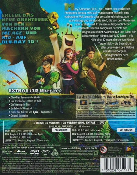 Enthält: Die echten Bewohner des Waldes; Der Kreislauf des Lebens im Wald; Die Tarnung der Tiere; Ein Leben in Winzigkeit; Hinter den Kulissen von "Epic"; Original Kinotrailer;