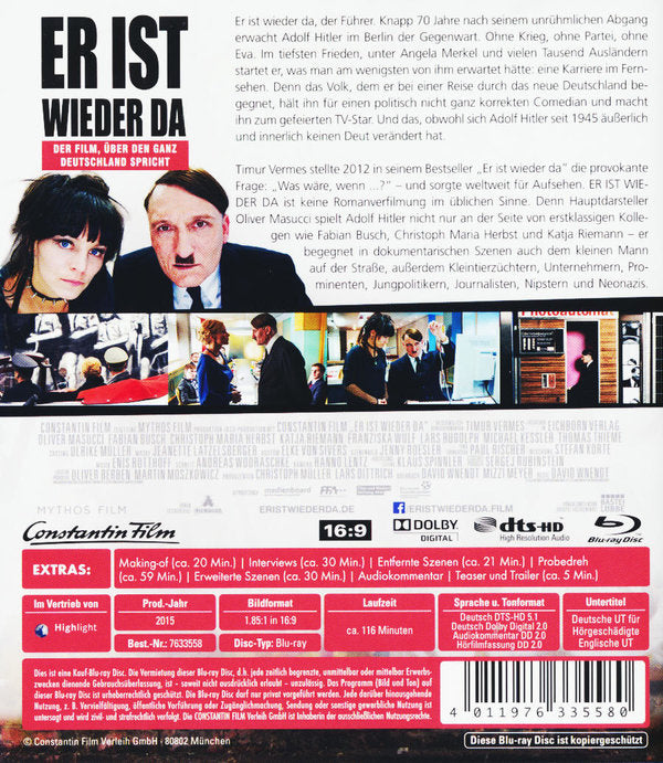 Er ist wieder da, der Führer. Knapp 70 Jahre nach seinem unrühmlichen Abgang erwacht Adolf Hitler im Berlin der Gegenwart. Ohne Krieg, ohne Partei, ohne Eva. Im tiefsten Frieden, unter Angela Merkel und vielen tausend Ausländern startet er, was man am wenigsten von ihm erwartet hätte: eine Karriere im Fernsehen. Denn das Volk, dem er bei einer Reise durch das neue Deutschland begegnet, hält ihn für einen politisch nicht ganz korrekten Comedian und macht ihn zum gefeierten TV-Star. Und das, obwohl sich Adolf Hitler seit 1945 äußerlich und innerlich keinen Deut verändert hat.