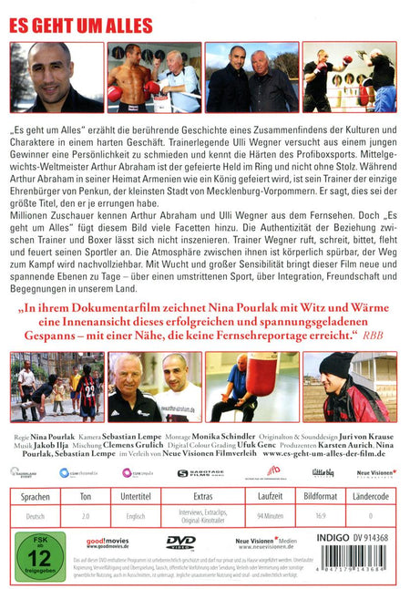 "Es geht um Alles" erzählt die berührende Geschichte eines Zusammenfindens der Kulturen und Charaktere in einem harten Geschäft. Dabei verteilt dieser Film ebenso kraftvolle wie authentische Geraden mitten in die Auseinandersetzungen zwischen Trainer und Boxer. Trainerlegende Ulli Wegner versucht aus einem jungen Gewinner eine Persönlichkeit zu schmieden und kennt die Härten des Profiboxsports. Mittelgewichts-Weltmeister Arthur Abraham ist der gefeierte Held im Ring und nicht ohne Stolz. Während Arthur Abraham in seiner Heimat Armenien wie ein König gefeiert wird, ist sein Trainer der einzige Ehrenbürger von Penkun, der kleinsten Stadt von Mecklenburg-Vorpommern. Er sagt, dies sei der größte Titel, den er je errungen habe.