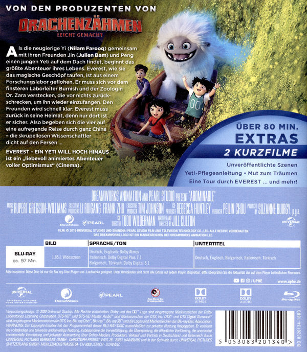 Von den Produzenten von "Drachenzähmen leicht gemacht"Als die neugierige Yi (Nilam Farooq) gemeinsam mit ihren Freunden Jin (Julien Bam) und Peng einen jungen Yeti auf dem Dach findet, beginnt das größte Abenteuer ihres Lebens. Everest, wie sie das magische Geschöpf taufen, ist aus einem Forschungslabor geflohen. Er muss sich vor dem finsteren Laborleiter Burnish und der Zoologin Dr. Zara verstecken, die vor nichts zurückschrecken, um ihn wieder einzufangen. Den Freunden wird schnell klar: Everest muss zurück in seine Heimat, denn nur dort ist er sicher. Also begeben sich die vier auf eine aufregende Reise durch ganz China - die skrupellosen Wissenschaftler dicht auf den Fersen ..."Everest - Ein Yeti will hoch hinaus" ist ein "liebevoll animiertes Abenteuer voller Optimismus" (Cinema).Inklusive über 80 Minuten Extras und zwei Kurzfilmen!