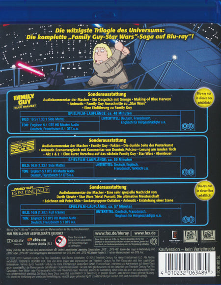 Die Lacher kommen mit aller "Macht. Erleben Sie den tollk�hnen Griffin-Clan in einer irrwitzigen Parodie auf die gr��te Sci-Fi-Saga aller Zeiten. Mit Peter als verwegener Han Solo, Lois als sexy Prinzessin Leia, Chris als halbw�chsiger Luke Skywalker, Brian als redegewandter Chewbacca und Stewie, der als Darth Vader die dunkle Seite der Macht entdeckt. Tolle Gags, spacige Droiden und so viel intergalaktische Satire, dass man ein Lichtschwert daran sch�rfen kann.