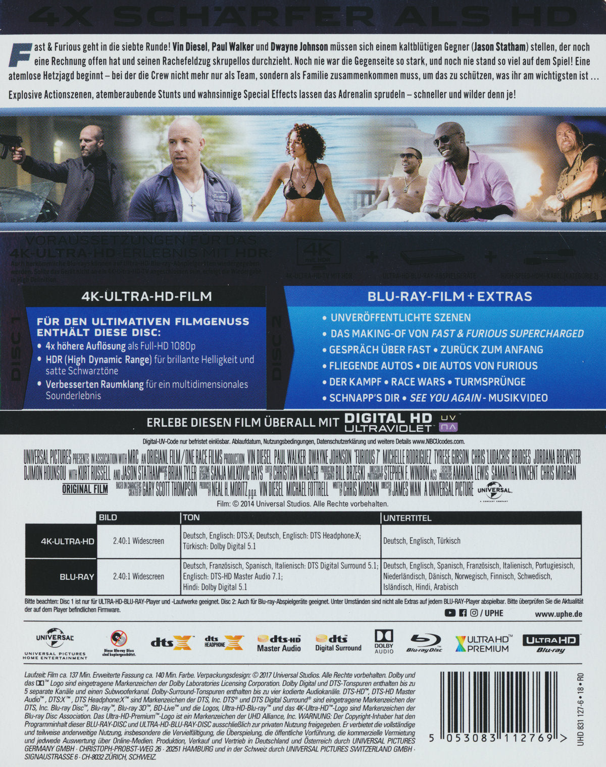 Enthält: Unveröffentlichte Szenen; Das Making of; Gespräch über Fast; Zurück zum Anfang; Fliegende Autos; Die Autos von Furious; Der Kampf; Race Wars; Turmsprünge; Schnapp's Dir; See You Again - Musikvideo;