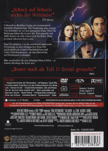 "Final Destination 2" ist die mörderisch spannende Fortsetzung zu dem erfolgreichen Kino-Hit: gut bestückt mit scharfen Spezialeffekten und vielen Schocksequenzen, um den Herzschlag auf Hochtouren zu bringen.