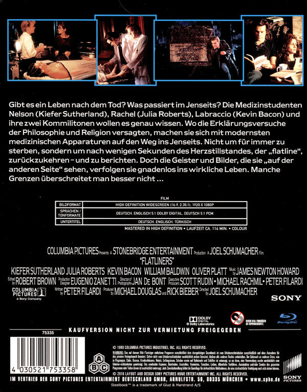 Gibt es ein Leben nach dem Tod? Was passiert im Jenseits? Die Medinzinstudenten Nelson (Kiefer Sutherland), Rachel (Julia Roberts), Labraccio (Kevin Bacon) und ihre zwei Kommilitonen wollens genau wissen. Wo die Erklärungsversuche der Philosophie und Religion versagten, machen sie sich mit modernster medizinischen Apparaten auf den Weg ins Jenseits. Nicht um für immer zu sterben, sondern nach wenigen Momenten des Herzstillstandes, der "flatline", zurückzukehren - und zu berichten. Doch die Geister und Bilder, die sie "auf der anderen Seite" sehen, verfolgen sie gnadenlos ins wirkliche Leben. Manche Grenzen überschreitet man besser nicht...