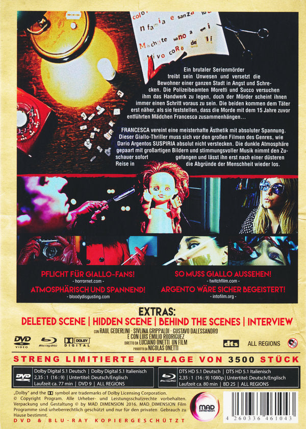 FRANCESCA vereint eine meisterhafte Ästhetik mit absoluter Spannung. Dieser Giallo-Thriller muss sich vor den großen Filmen des Genres, wie Dario Argentos SUSPIRIA absolut nicht verstecken. Die dunkle Atmosphäre gepaart mit großartigen Bildern und stimmungsvoller Musik nimmt den Zuschauer sofort gefangen und lässt ihn erst nach einer düsteren Reise in die Abgründe der Menschheit wieder los.