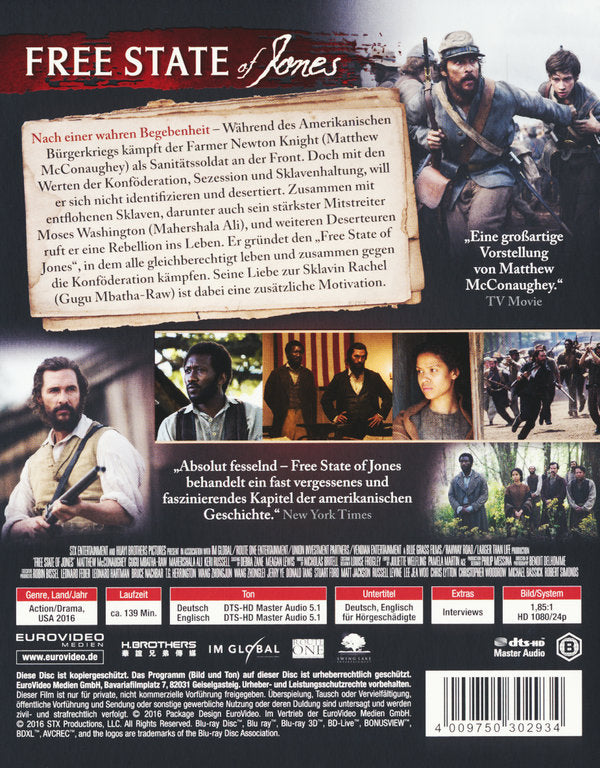 Nach einer wahren Begebenheit – 1862, der einfache Farmer Newton Knight (Matthew McConaughey) kämpft im Amerikanischen Bürgerkrieg als Sanitätssoldat an der Front für die Südstaaten gegen die Union. Doch mit den Werten der Konföderierten, Sezession und Sklavenhaltung, will er sich nicht identifizieren. Für ihn sollte jeder Mensch gleich behandelt werden. Er wendet sich ab, desertiert und ruft eine Rebellion ins Leben. Zusammen mit entflohenen Sklaven und Deserteuren gründet er den „Free State of Jones“, in dem alle gleichberechtigt leben und zusammen gegen die Südstaaten kämpfen. Die Liebe zur Sklavin Rachel (Gugu Mbatha-Raw) ist dabei eine zusätzliche Motivation. Einer seiner stärksten Mitstreiter ist der entflohene Sklave Moses Washington (Mahershala Ali), dessen Frau und Sohn in Texas in Sklaverei leben.
