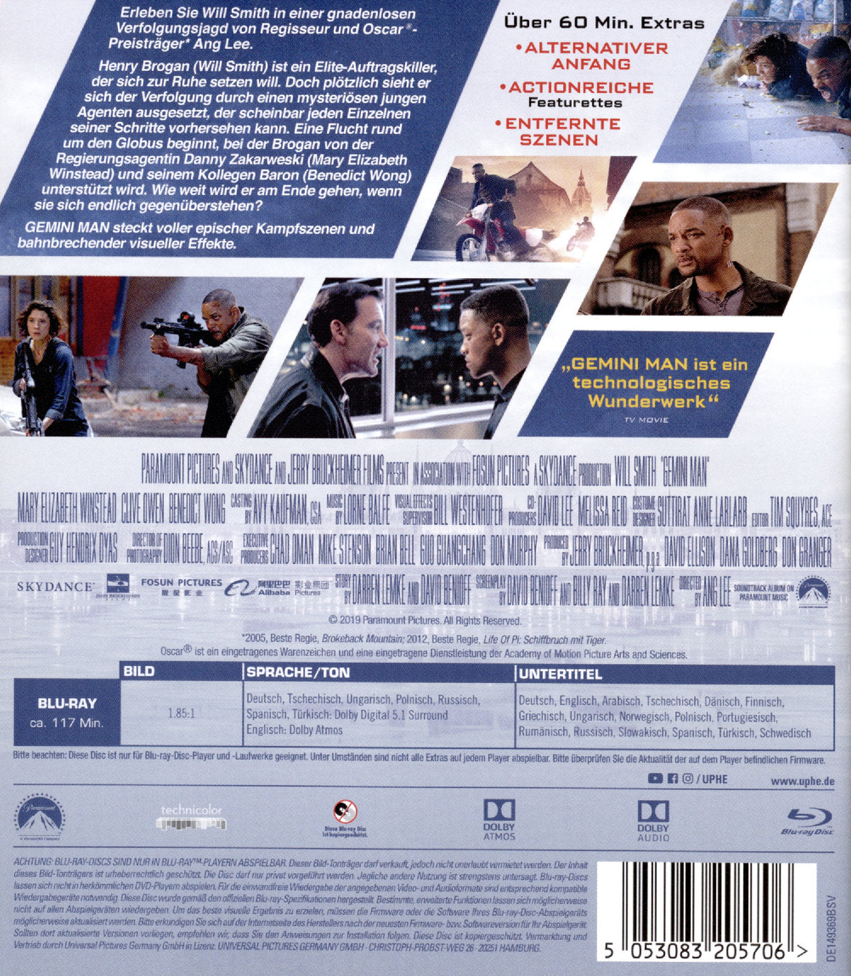 Erleben Sie Will Smith in einer gnadenlosen Verfolgungsjagd von Regisseur und Oscar�-Preistr�ger�Ang Lee.Henry Brogan (Will Smith) ist ein Elite-Auftragskiller, der sich zur Ruhe setzen will. Doch pl�tzlich sieht er sich der Verfolgung durch einen mysteri�sen jungen Agenten ausgesetzt, der scheinbar jeden Einzelnen seiner Schritte vorhersehen kann. Eine Flucht rund um den Globus beginnt, bei der Brogan von der Regierungsagentin Danny Zakarweski (Mary Elizabeth Winstead) und seinem Kollegen Baron (Benedict Wong) unterst�tzt wird. Wie weit wird er am Ende gehen, wenn sie sich endlich gegen�berstehen?"Gemini Man" steckt voller epischer Kampfszenen und bahnbrechender visueller Effekte."Gemini Man ist ein technologisches Wunderwerk" (TV Movie)