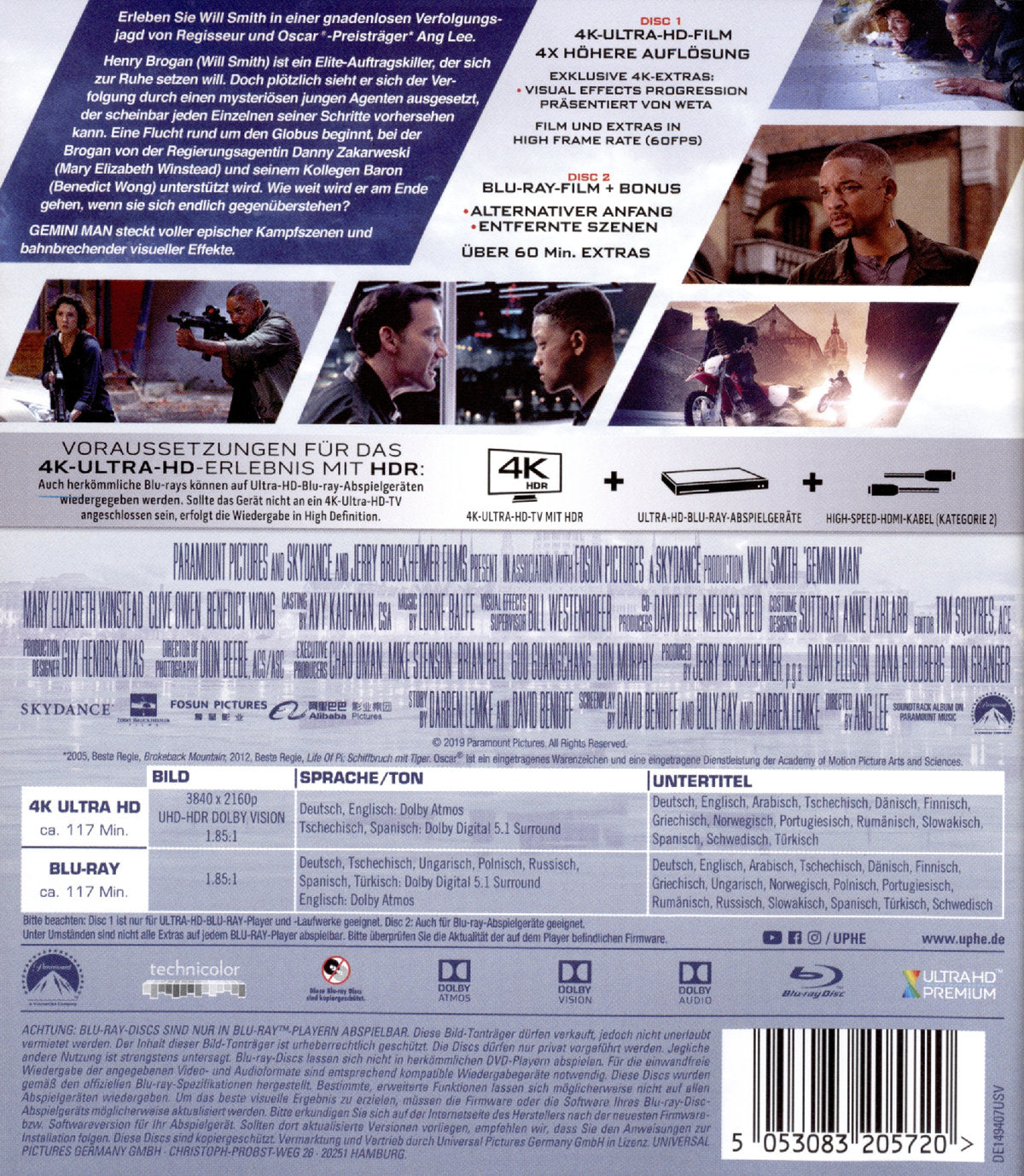 Erleben Sie Will Smith in einer gnadenlosen Verfolgungsjagd von Regisseur und Oscar®-Preisträger Ang Lee.Henry Brogan (Will Smith) ist ein Elite-Auftragskiller, der sich zur Ruhe setzen will. Doch plötzlich sieht er sich der Verfolgung durch einen mysteriösen jungen Agenten ausgesetzt, der scheinbar jeden Einzelnen seiner Schritte vorhersehen kann. Eine Flucht rund um den Globus beginnt, bei der Brogan von der Regierungsagentin Danny Zakarweski (Mary Elizabeth Winstead) und seinem Kollegen Baron (Benedict Wong) unterstützt wird. Wie weit wird er am Ende gehen, wenn sie sich endlich gegenüberstehen?"Gemini Man" steckt voller epischer Kampfszenen und bahnbrechender visueller Effekte."Gemini Man ist ein technologisches Wunderwerk" (TV Movie)