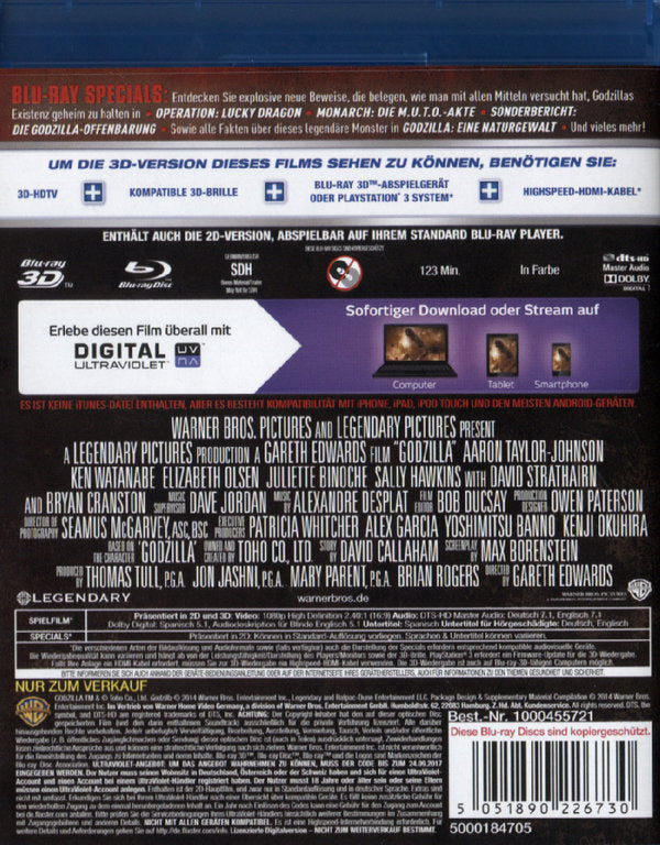 Die spektakuläre Wiedergeburt des meistverehrten Monsters der Welt: Godzilla. Der junge Regisseur Gareth Edwards entwickelt die mitreißende Vision menschlicher Tapferkeit und riedenssehnsucht im Angesicht titanischer Naturgewalten, denen nur der monumentale Godzilla entgegentreten kann, weil die Menschheit ihnen schutzlos ausgeliefert ist. Gareth Edwards inszeniert Godzilla mit Aaron Taylor-Johnson, Ken Watanabe, Elizabeth Olsen, Juliette Binoche, Sally Hawkins, David Strathairn sowie Bryan Cranston in den Hauptrollen.