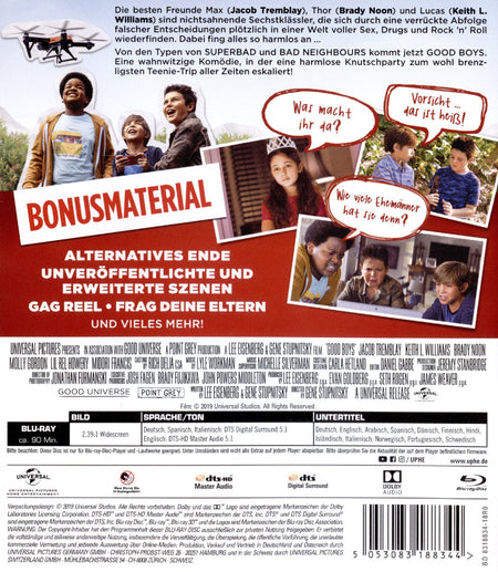 Die besten Freunde Max (Jacob Tremblay), Thor (Brady Noon) und Lucas (Keith L. Williams) sind nichtsahnende Sechstklässler, die sich durch eine verrückte Abfolge falscher Entscheidungen plötzlich in einer Welt voller Sex, Drugs und Rock 'n' Roll wiederfinden. Dabei fing alles so harmlos an ...Von den Typen von "Superbad" und "Bad Neighbours" kommt jetzt "Good Boys". Eine wahnwitzige Komödie, in der eine harmlose Knutschparty zum wohl brenzligsten Teenie-Trip aller Zeiten eskaliert!