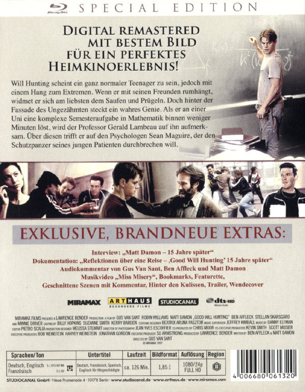 Enthält: Interview: "Matt Damon - 15 Jahre später"; Dokumentation: "Reflektionen über eine Reise - 'Good Will Hunting' 15 Jahre später"; Audiokommentar von Gus van Sant, Ben Affleck und Matt Damon; Musikvideo "Miss Misery"; Bookmarks; Featurette; Geschnittene Szenen mit Kommentar; Hinter den Kulissen; Trailer;