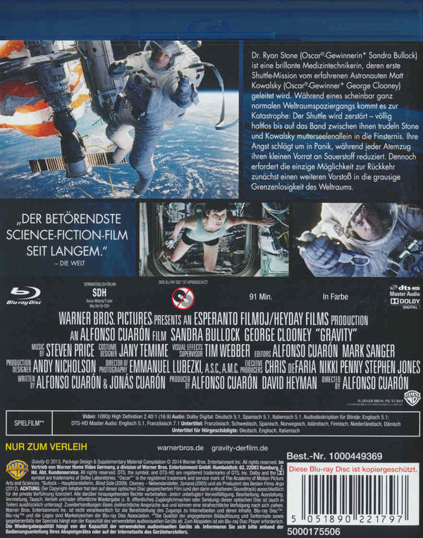 Dr. Ryan Stone ist eine brillante Medizintechnikerin, deren erste Shuttle-Mission vom erfahrenen Astronauten Matt Kowalsky geleitet wird. Während eines scheinbar ganz normalen Weltraumspaziergangs kommt es zur Katastrophe: Der Shuttle wird zerstört - völlig haltlos bis auf das Band zwischen ihnen trudeln Stone und Kowalsky mutterseelenallein in die Finsternis. Ihre Angst schlägt um in Panik, während jeder Atemzug ihren kleinen Vorrat an Sauerstoff reduziert. Dennoch erfordert die einzige Möglichkeit zur Rückkehr zunächst einen weiteren Vorstoß in die grausige Grenzenlosigkeit des Weltraums.