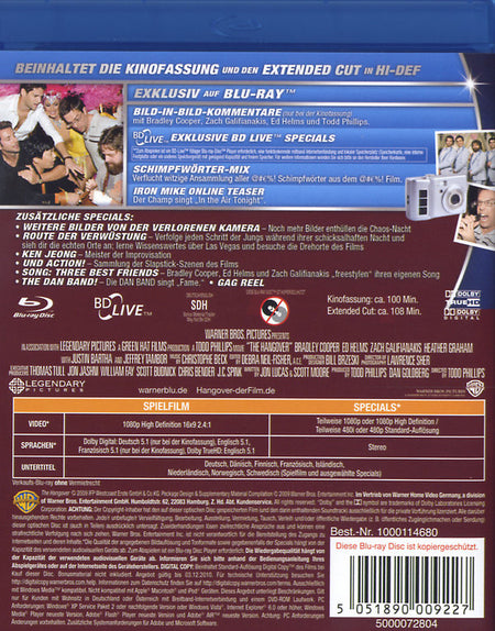 Enthält: Weitere Bilder von der verlorenen Kamera; Route der Verwüstung; Ken Jeong - Meister der Improvisation; Und Action! - Sammlung der Slapstick-Szenen des Films; Song "Three Best Friends"; The Dan Band!; Gag Reel; Bild-in-Bild-Kommentare; BD-Live; Schimpfwörter-Mix; Iron Mike Online Teaser; Inkl. Digital-Copy des Films "Hangover" zum Download (Angebot gültig bis 03.12.2010);
