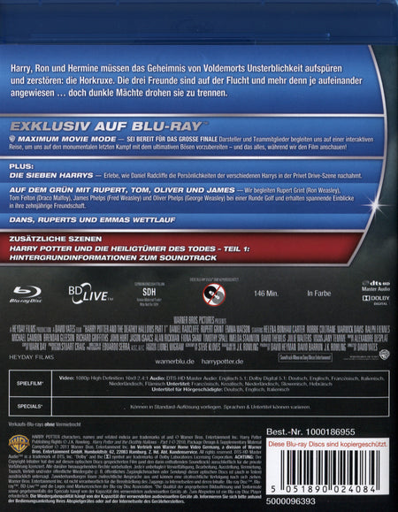 Enthält: Maximum Movie Mode - Sei bereit für das große Finale; Die sieben Harrys; Auf dem Grün mit Rupert, Tom, Oliver und James; Dans, Ruperts und Emmas Wettlauf; Zusätzliche Szenen; Harry Potter und die Heiligtümer des Todes - Teil 1: Hintergrundinformationen zum Soundtrack; Mit einer exklusiven Szene aus dem Filmfinale;