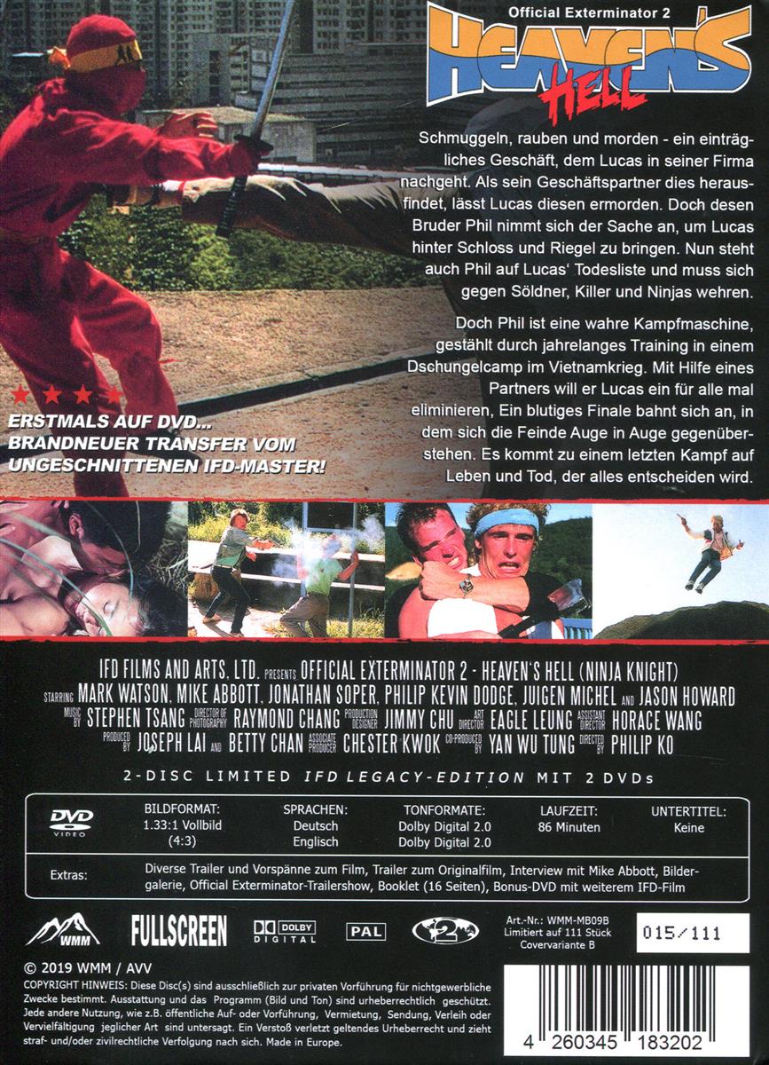 Enthält: - IFD Legacy-Edition - Limitiertes Mediabook - Neuer Transfer vom Original IFD Master - Deutsche DVD-Premiere - Ungeschnitten - 16-seitiges Booklet - US-Trailer zum Film - Alter deutscher Vorspann - Alter US-Vorspann - Trailer zum Originalfilm - Interview mit Mike Abbott - Official Exterminator-Trailershow - Trailer zum Film - Bildergalerie - Inkl. Bonus-DVD mit weiterem IFD-Film