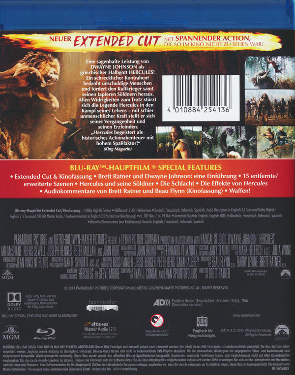 Enthält: Extended Cut & Kinofassung; Brett Ratner und Dwayne Johnson: Eine Einführung; 15 entfernte/erweiterte Szenen; Hercules und seine Söldner; Die Schlacht; Die Effekte von Hercules; Audiokommentar; Waffen!;