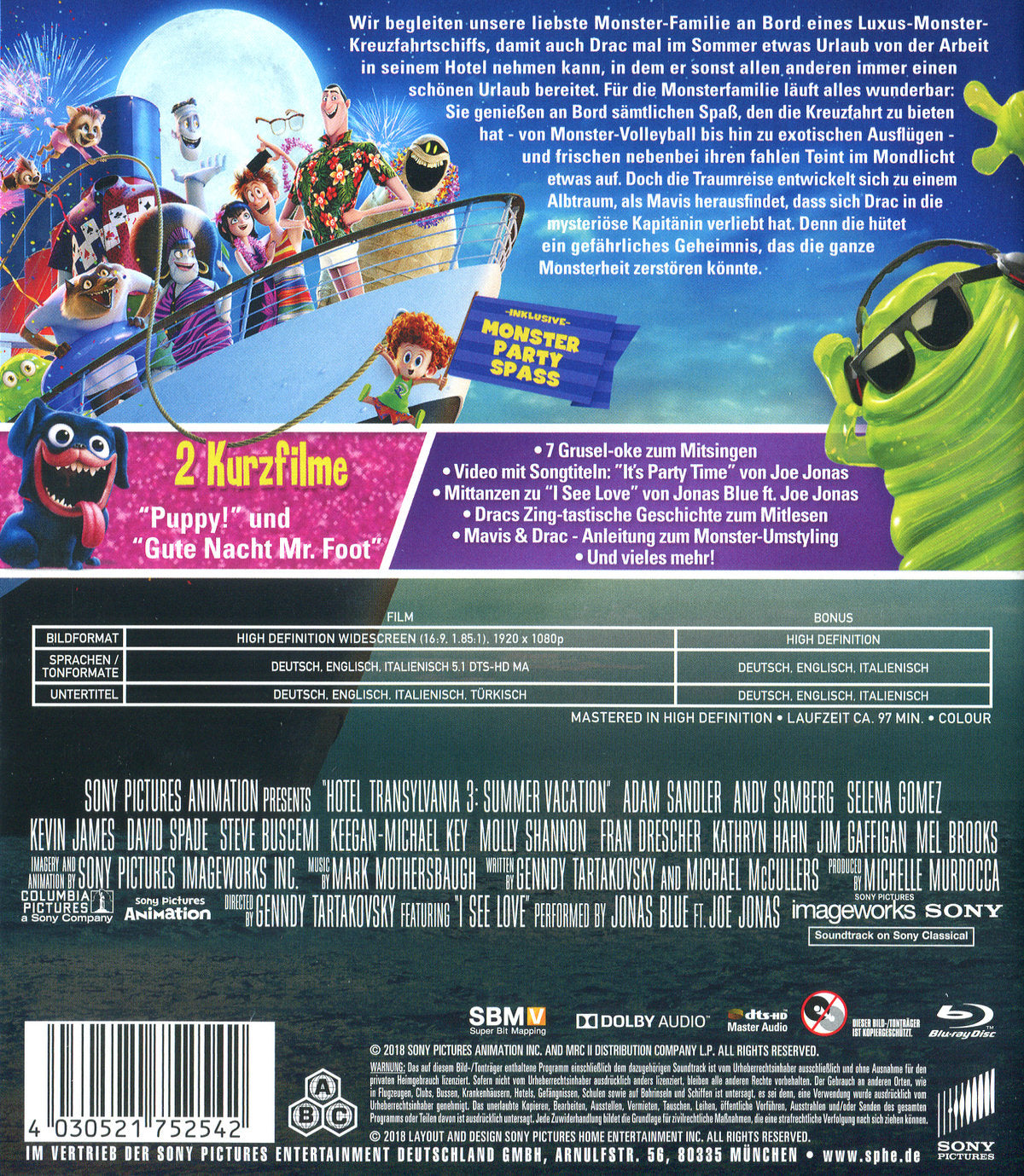 Enthält: 2 Kurzfilme: "Puppy!" und "Gute Nacht Mr. Foot" ; Blu-Ray Extras 7 Grusel-oke zum Mitsingen; Video mit Songtiteln:"It's Party Time" von Joe Jonas; Mittanzen zu "I See Love" von Jonas Blue ft. Joe Jonas; Dracs Zing-tastische Geschichte zum Mitlesen; Mavis & Drac - Anleitung zum Monster-Umstyling; Und vieles mehr!;