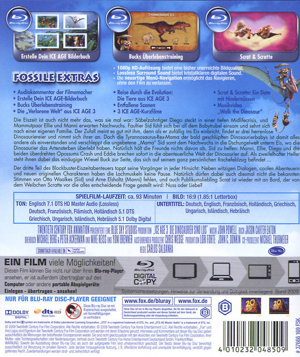 Enthält: Inkl. Digital Copy zum Download; Audiokommentar der Filmemacher; Erstelle Dein ICE AGE-Bilderbuch; Bucks Überlebenstraining; Reise durch die Evolution: Die Tiere aus ICE AGE 3; Die "Verlorene Welt" aus ICE AGE 3; Entfallene Szenen; Musikvideo "Walk the Dinosaur"; 3 ICE AGE-Kurzfilme; Scrat & Scratte: Ein Date mit Hindernissen;