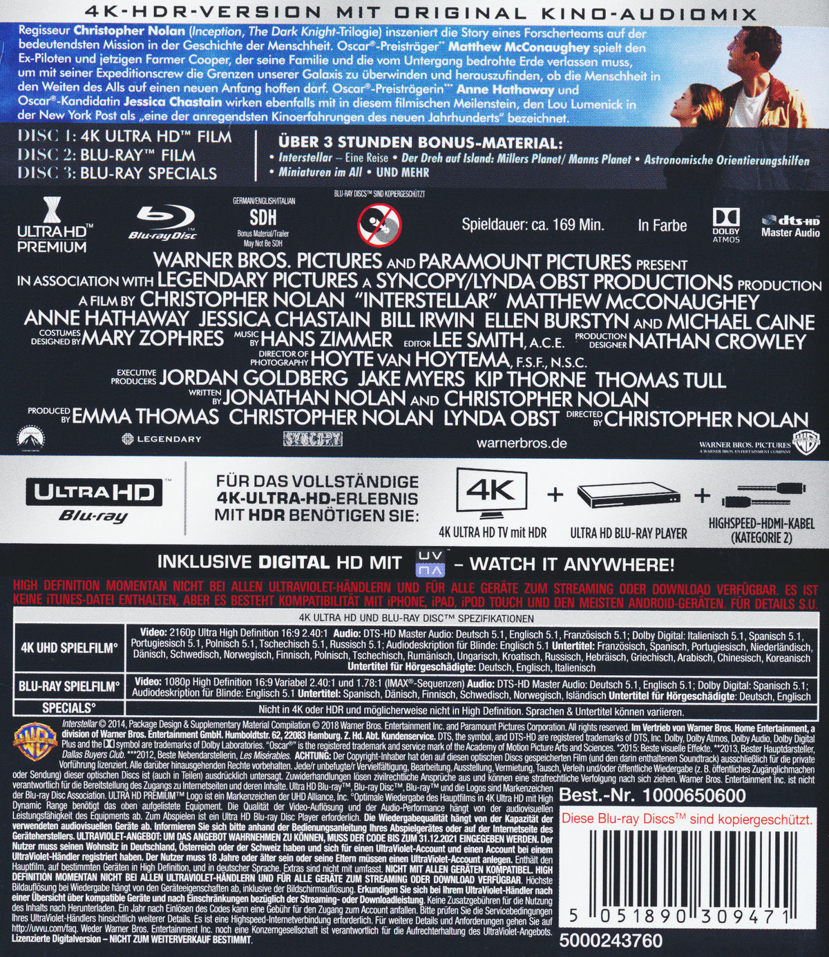 Der gefeierte Filmemacher Christopher Nolan („The Dark Knight“-Filme, „Inception“) inszeniert „Interstellar“ mit internationaler Besetzung. Da sich unsere Zeit auf der Erde dem Ende zuneigt, unternimmt ein Forscherteam die wohl wichtigste Mission in der Geschichte der Menschheit: Es reist jenseits dieser Galaxie, um andere Lebensräume im Weltall für die Menschen zu erkunden.