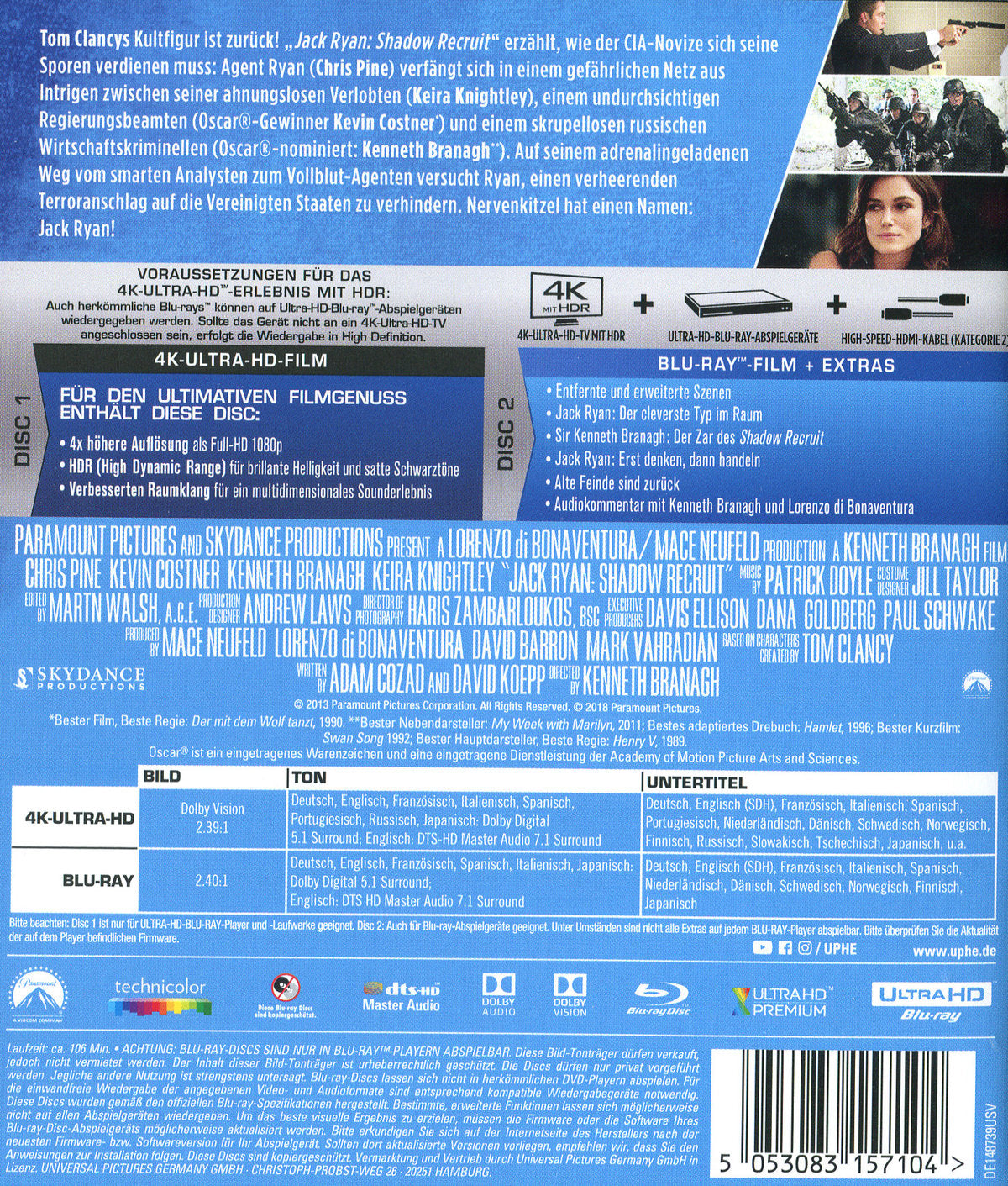 Enthält: Entfernte und erweiterte Szenen; Jack Ryan: Der cleverste Typ im Raum; Sir Kenneth Branagh: Der Zar des Shadow Recruit; Jack Ryan: Erst denken, dann handeln; Alte Feinde sind zurück; Audiokommentar;