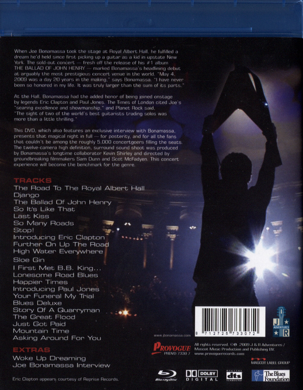 Ohne Frage ist Bonamassa einer der aufregensten und erfolgreichsten Blues Rock Musiker der Gegenwart. Vor fast genau einem Jahr am 25. September 2009 wurde dieses sagenhafte Konzert aus der legendären Royal Albert Hall bereits als DVD-Set veröffentlicht. Der Gastauftritt des einzigartigen Weltstars Eric Clapton macht das Konzert zu einem einzigartigen Erlebnis! Der vielbeschäftige Musiker Joe Bonamassa ist gleichzeitig mit seinem großartigen Nebenprojekt Black Country Communion äußerst erfolgreich unterwegs. Jetzt also als Blu-Ray Disc für alle Genießer der optischen High-Definition Qualität!!!