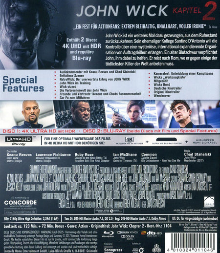 Enthält: Audiokommentar; Entfallene Szenen; RetroWick: Der unerwartete Erfolg von JOHN WICK, John Wick im Training, Wick-vizzed, Die Verbrecherwelt des John Wick, Freunde und Vertraute: Keanus und Chads Zusammenarbeit; Car Fu zum Mitfahren; Kameratest: Entwicklung einer Kampfszene, Wicks "Werkzeugkiste", Mitgezählt, Wicks Hund; Deutsche und Original-Kinotrailer; Wendecover;