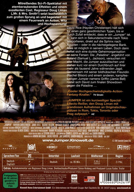 David Rice hatte sich immer für einen ganz normalen Typen gehalten, bis er mit 15 seine Fähigkeit zu springen entdeckt. Binnen Sekunden kann er sich an jeden beliebigen Ort der Welt teleportieren. Die perfekte Methode, seinem tristen Elternhaus zu entkommen und bei einem Zwischenstopp im Banktresor gleich noch das nötige Kleingeld für ein Luxusleben in New York einzusammeln. David genießt seine neue Mobilität in vollen Zügen: Morgens zum Surfen nach Hawaii, mittags Lunch auf dem Kopf der Sphinx und abends ein Abstecher in die Londoner Clubszene. Als er den abgebrühten Griffin kennenlertn, stellt sich heraus, dass er längst nicht der einzige Jumper. Doch sein Leben ist in höchster Gefahr. Die hochspezialisierte Geheimorganisation der Paladinen will Menschen wie David auslöschen - und ihr skrupelloser Anführer Cox ist ihm ganz dicht auf den Fersen.