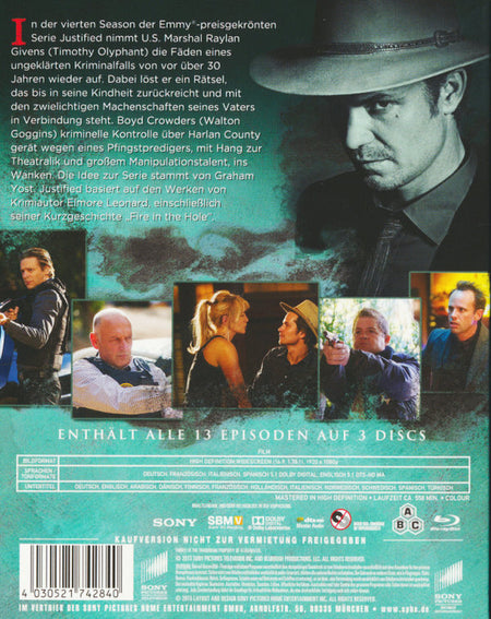 In der vierten Season der Emmy®-preisgekrönten Serie Justified nimmt U.S. Marshal Raylan Givens die Fäden eines ungeklärten Kriminalfalls von vor über 30 Jahren wieder auf. Dabei löst er ein Rätsel, das bis in seine Kindheit zurückreicht und mit den zwielichtigen Machenschaften seines Vaters in Verbindung steht. Boyd Crowders kriminelle Kontrolle über Harlan County gerät wegen eines Pfingstpredigers, mit Hang zur Theatralik und großem Manipulationstalent, ins Wanken. Die Idee zur Serie stammt von Graham Yost. Justified basiert auf den Werken von Krimiautor Elmore Leonard, einschließlich seiner Kurzgeschichte „Fire in the Hole”.