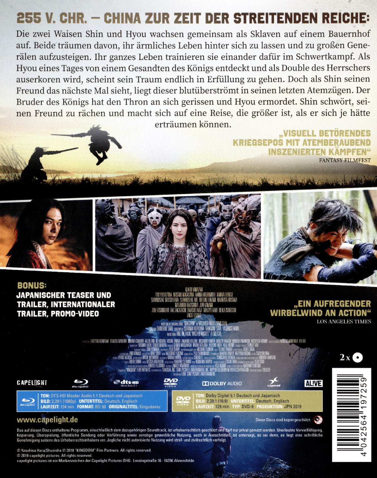 Die zwei Waisen Shin und Hyou wachsen gemeinsam als Sklaven auf einem Bauernhof auf. Beide träumen davon, ihr ärmliches Leben eines Tages hinter sich zu lassen und zu großen Generälen aufzusteigen. Ihr ganzes Leben trainieren sie einander dafür im Schwertkampf. Als Hyou eines Tages von einem Gesandten des Königs entdeckt und als Double des Herrschers auserkoren wird, scheint sein Traum endlich in Erfüllung zu gehen. Doch als Shin seinen Freund das nächste Mal sieht, liegt dieser blutüberströmt in seinen letzten Atemzügen. Der Bruder des Königs hat den Thron an sich gerissen und Hyou ermordet. Shin schwört, seinen Freund zu rächen und macht sich auf eine Reise, die größer ist, als er sich je hätte erträumen können. Presse: Ein aufregender Wirbelwind an Action. (LOS ANGELES TIMES) Punktet mit farbenfrohen Charakteren, weltklasse Schwertkämpfen und flotten Dialogen. (VARIETY) Große Kampfszenen, schwierige Verhandlungen mit listigen Kriegsherren und spannende Kämpfe sind an der Tagesordnung! (VARIETY) 'Kingdom' greift auf das Beste aus mehreren Traditionen zurück. (THE NEW YORK TIMES)