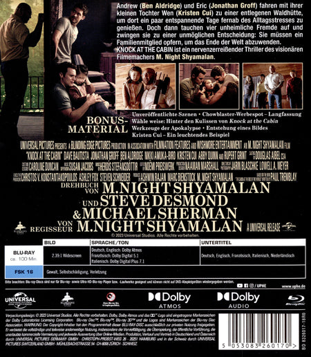 Enthält: Unveröffentlichte Szenen, Chowblaster Werbespot; Langfassung, Wähle Weise: Hinter den Kulissen von "Knock at the Cabin",Werkzeuge der Apokalypse,Entstehung eines Bildes, Kristen Cui - Ein Leuchtendes Beispiel; Wendecover;