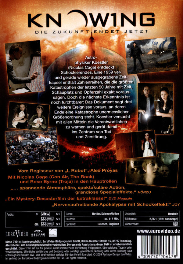 1959 in Lexington, Massachusetts: Schüler einer Klasse beschreiben in einem Experiment ihre Visionen der Zukunft und lagern die Unterlagen in einer Zeitkapsel vor der Schule ein. Fünfzig Jahre später wird diese geöffnet und die Notizen und Zeichnungen von damals werden an die jetzigen Schüler ausgehändigt. Caleb Koestler, der Sohn von Astrophysiker John Koestler, bekommt ein mysteriöses Blatt Papier, auf dem sich eine scheinbar willkürliche Aneinanderreihung von Zahlenkolonnen befindet. John beginnt schnell an deren Zufälligkeit zu zweifeln. Er entdeckt einen Code, der Schreckliches offenbart: Die Zahlen bezeichnen mit unglaublicher Präzision die Zahl der Opfer und das Datum der schlimmsten globalen Katastrophen und Unfälle der letzte 50 Jahre. Doch die nächste Erkenntnis ist noch furchtbarer: Das Dokument sagt drei weitere Ereignisse voraus, an deren Ende eine Katastrophe unermesslicher Größenordnung steht.