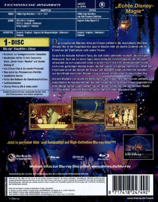 Enthält: Musikvideo "Never Knew I Needed" mit Cassandra Steen & Ne-Yo; Zusätzliche Szenen; Was siehst du: Prinzessinnen-Porträts; Making Of "Küss mich Frosch"; Die Rückkehr zur handgezeichneten Animation; Das Disneys Erbe und die neuste Prinzessin; Hinter den Kulissen der Synchronaufnahmen; Audiokommentar;