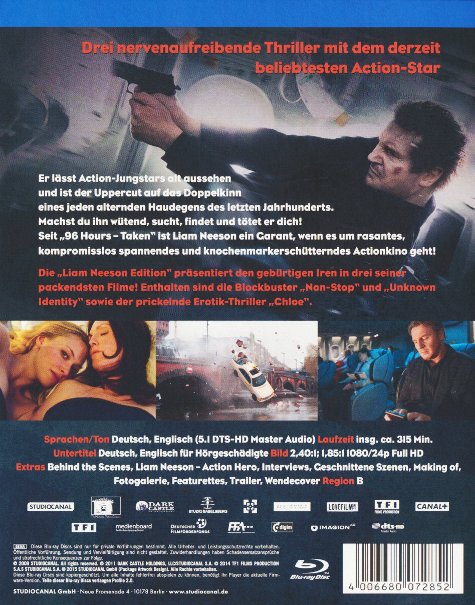 Er lässt Action-Jungstars alt aussehen und ist der Upper-Cut auf das Doppelkinn eines jeden alternden Haudegen des letzten Jahrhunderts. Machst du ihn wütend, sucht, findet und tötet er dich! Seit „96 Hours – Taken“ ist Liam Neeson ein Garant, wenn es um rasantes, kompromisslos spannendes und knochenmarkerschütterndes Actionkino geht! Die „Liam Neeson Edition“ präsentiert den Iren in all seinen schauspielerischen Facetten – von Drama bis Thrill ist alles dabei! Enthalten sind die Blockbuster „Non-Stop“ und „Unknown Identity“ sowie der prickelnde Erotik-Thriller „Chloe“.