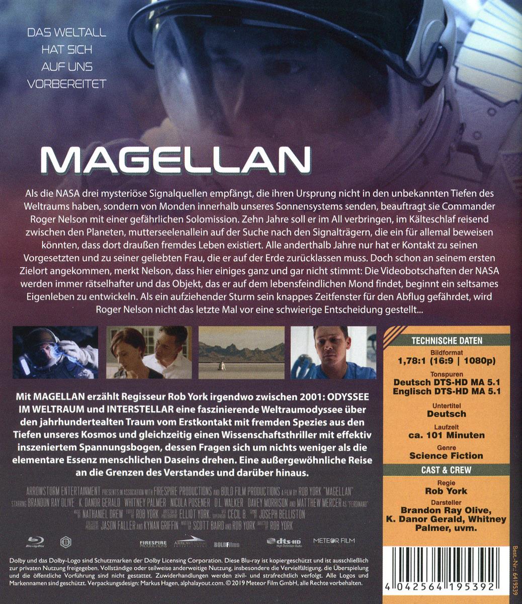 Als die NASA drei mysteri�se Signalquellen empf�ngt, die ihren Ursprung nicht in den unbekannten Tiefen des Weltraums haben, sondern von Monden innerhalb unseres Sonnensystems senden, beauftragt sie Commander Roger Nelson mit einer gef�hrlichen Solomission. Zehn Jahre soll er im All verbringen, im K�lteschlaf reisend zwischen den Planeten, mutterseelenallein auf der Suche nach den Signaltr�gern, die ein f�r allemal beweisen k�nnten, dass dort drau�en fremdes Leben existiert. Alle anderthalb Jahre nur hat er Kontakt zu seinen Vorgesetzten und zu seiner geliebten Frau, die er auf der Erde zur�cklassen muss. Doch schon an seinem ersten Zielort angekommen, merkt Nelson, dass hier einiges ganz und gar nicht stimmt: Die Videobotschaften der NASA werden immer r�tselhafter und das Objekt, das er auf dem lebensfeindlichen Mond findet, beginnt ein seltsames Eigenleben zu entwickeln. Als ein aufziehender Sturm sein knappes Zeitfenster f�r den Abflug gef�hrdet, wird Roger Nelson nicht das letzte Mal vor eine schwierige Entscheidung gestellt... Mit MAGELLAN erz�hlt Regisseur Rob York irgendwo zwischen 2001: ODYSSEE IM WELTRAUM und INTERSTELLAR eine faszinierende Weltraumodyssee �ber den jahrhundertealten Traum vom Erstkontakt mit fremden Spezies aus den Tiefen unseres Kosmos und gleichzeitig einen Wissenschaftsthriller mit effektiv inszeniertem Spannungsbogen, dessen Fragen sich um nichts weniger als die elementare Essenz menschlichen Daseins drehen. Eine au�ergew�hnliche Reise an die Grenzen des Verstandes und dar�ber hinaus.
