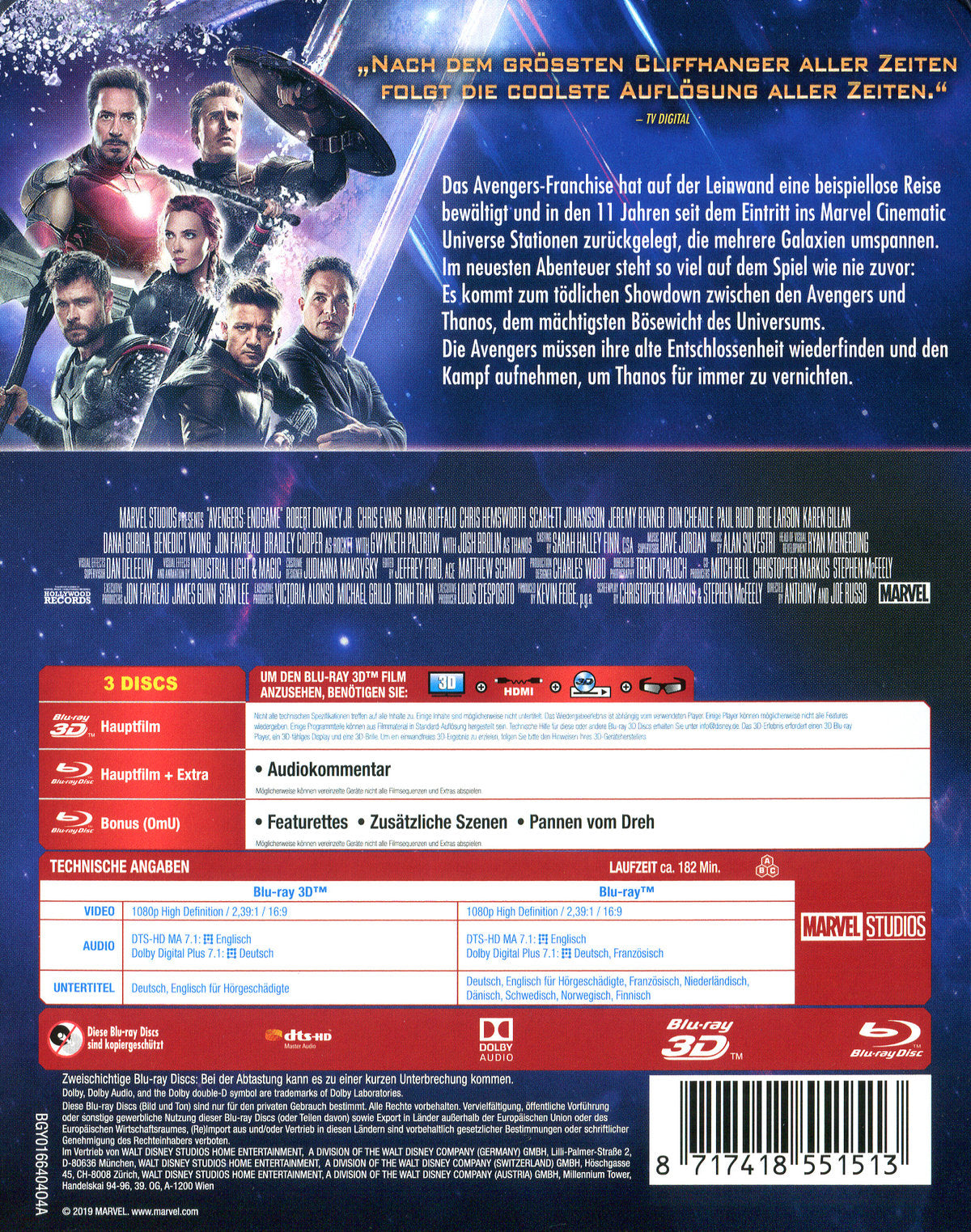 Das Avengers-Franchise hat auf der Leinwand eine beispiellose Reise bewältigt und in den 11 Jahren seit dem Eintritt ins Marvel Cinematic Universe Stationen zurückgelegt, die mehrere Galaxien umspannen. Im neuesten Abenteuer steht so viel auf dem Spiel wie nie zuvor: Es kommt zum tödlichen Showdown zwischen den Avengers und Thanos, dem mächtigsten Bösewicht des Universums. Die Avengers müssen ihre alte Entschlossenheit wiederfinden und den Kampf aufnehmen, um Thanos für immer zu vernichten.