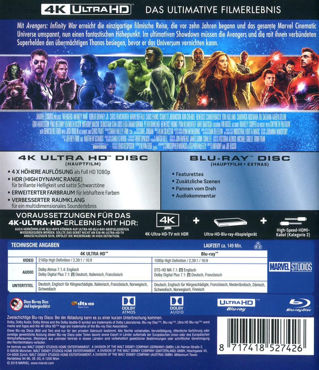 Mit Avengers: Infinity War erreicht die einzigartige filmische Reise, die vor zehn Jahren begann und das gesamte Marvel Cinematic Universe umspannt, nun einen fantastischen Höhepunkt. Im ultimativen Showdown müssen die Avengers und die mit ihnen verbündeten Superhelden den übermächtigen Thanos besiegen, bevor er das Universum vernichten kann.