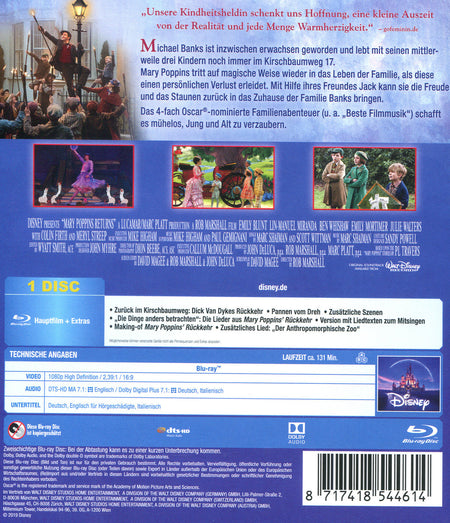 Enthält: Zurück im Kirschbaumweg: Dick Van Dykes Rückkehr; Pannen vom Dreh; Zusätzliche Szenen; "Die Dinge anders betrachten": Die Lieder aus Mary Poppins Rückkehr; Version mit Liedtexten zum Mitsingen; Making of Mary Poppins Rückkehr; Zusätzliches Lied: "Der Anthropomorphische Zoo";