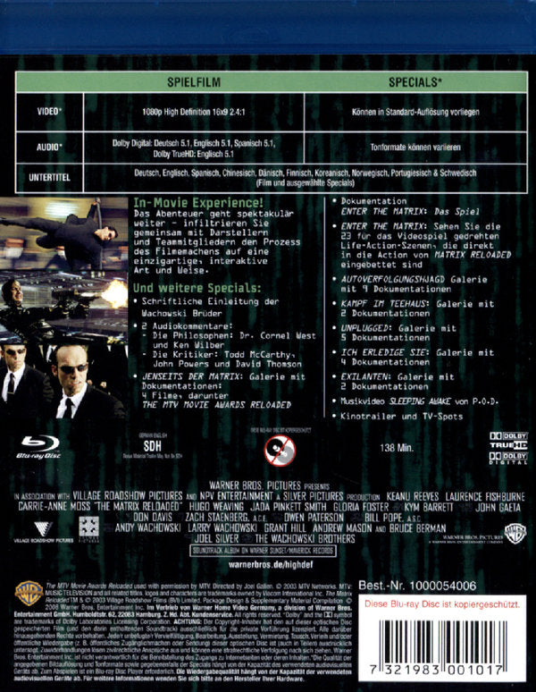 Enthält: In-Movie Experience! Das Abenteuer geht spektakulär weiter - infiltrieren Sie gemeinsam mit Darstellern und Teammitgliedern den Prozess des Filmemachens auf eine einzigartige, interaktive Art und Weise; Schriftliche Einleitung der Wachowski Brüder; 2 Audiokommentare: - Die Philosophen: Dr. Cornel West und Ken Wilber - Die Kritiker: Todd McCarthy, John Powers und David Thomson; "Jenseits der Matrix" Galerie mit Dokumentationen: 4 Filme, darunter "The MTV Movie Awards Reloaded"; Dokumentation: "Enter The Matrix: Das Spiel"; "Enter The Matrix": Sehen Sie die 23 für das Videospiel gedrehten Life-Action-Szenen, die direkt in die Action von "Matrix Reloaded" eingebettet sind; "Autoverfolgungsjagd" Galerie mit 9 Dokumentationen; "Kampf im Teehaus": Galerie mit 2 Dokumentationen; "Unplugged": Galerie mit 5 Dokumentationen; "Ich erledige Sie": Galerie mit 4 Dokumentationen; "Exilanten": Galerie mit 2 Dokumentationen; Musikvideo "Sleeping Awake" von P.O.D.; Kinotrailer und TV-Spots;