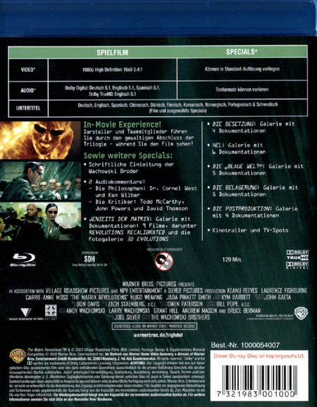 Enthält: In-Movie Experience! Darsteller und Teammitglieder führen Sie durch den gewaltigen Abschluss derTrilogie - während Sie den Film sehen; Schriftliche Einleitung der Wachowski Brüder; 2 Audiokommentare: - Die Philosophen: Dr. Cornel West und Ken Wilber - Die Kritiker: Todd McCarthy, John Powers und David Thomson; "Jenseits der Matrix" Galerie mit Dokumentationen: 9 Filme, darunter "Revolutions Recalibrated" und die Fotogalerie "3D Evolutions"; "Die Besetzung": Galerie mit 4 Dokumentationen; "HEL": Galerie mit 6 Dokumentationen; Die "Blaue Welt": Galerie mit 5 Dokumentationen; "Die Belagerung": Galerie mit 5 Dokumentationen; "Die Postproduktion": Galerie mit 4 Dokumentationen; Kinotrailer und TV-Spots;