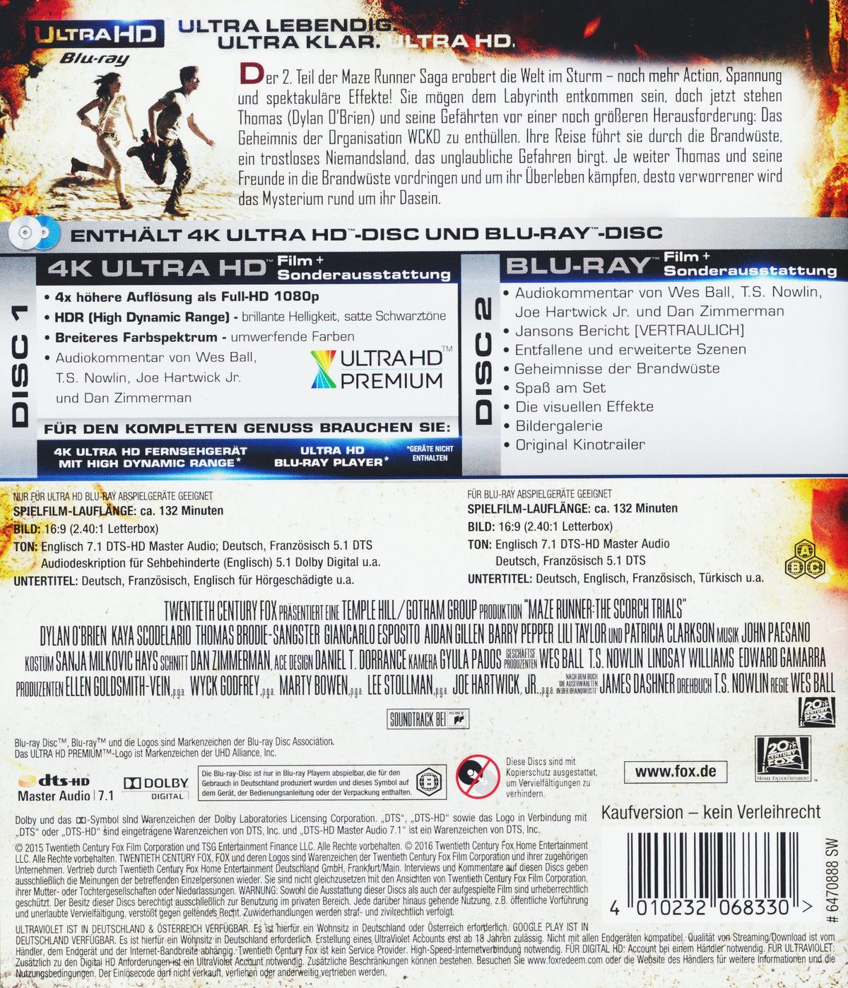 Der 2. Teil der Maze Runner Saga erobert die Welt im Sturm - noch mehr Action, Spannung und spektakuläre Effekte! Sie mögen dem Labyrinth entkommen sein, doch jetzt stehen Thomas (Dylan O'Brien) und seine Gefährten vor einer noch größeren Herausforderung: Das Geheimnis der Organisation WCKD zu enthüllen. Ihre Reise führt sie durch die Brandwüste, ein trostloses Niemandsland, das unglaubliche Gefahren birgt. Je weiter Thomas und seine Freunde in die Brandwüste vordringen und um ihr Überleben kämpfen, desto verworrener wird das Mysterium rund um ihr Dasein.
