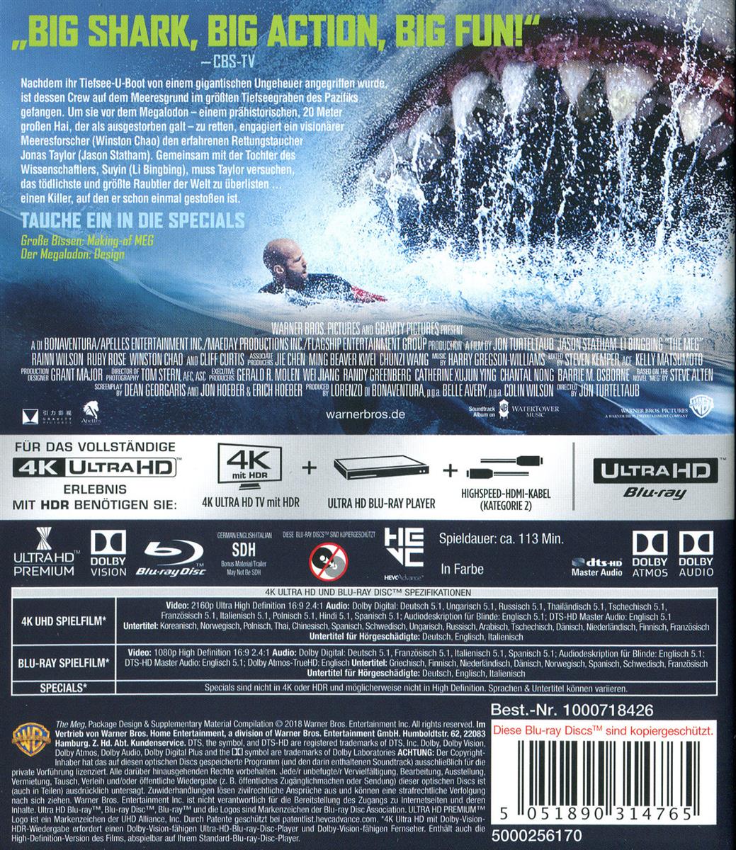 Enthält: Technische Info Blu-ray 2D: Tonformat: DD5.1 Deutsch, Französisch, Italienisch, Spanisch Audiodeskription für Blinde DTS HD MA 5.1 Englisch Dolby Atmos-TrueHD: Englisch Untertitel: Griechisch, Finnisch, Niederländisch, Dänisch, Norwegisch, Spanisch, Schwedisch, Französisch; Untertitel für Hörgeschädigte Deutsch, Englisch, Italienisch Grosse Bissen: Making of MEG; Der Megalodon: Design;