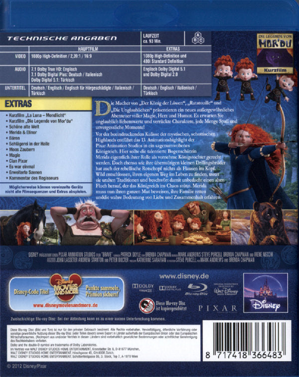 Enthält: Kurzfilm "La Luna - Mondlicht"; Kurzfilm "Die Legende von Mor'du"; Schöne alte Welt; Merida & Elinor; Bären; Schlägerei in der Halle; Moos Zaubern; Magie; Clean Pixar; Es war einmal; Erweiterte Szenen; Kommentar des Regiesseurs;