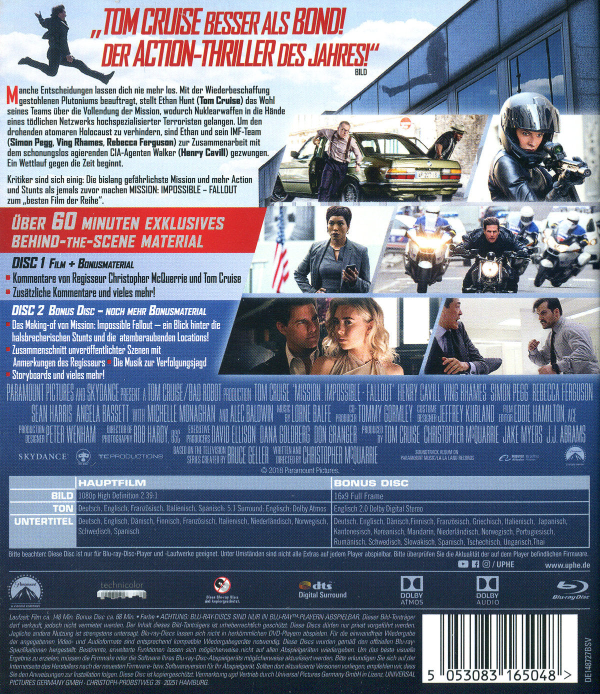 Manche Entscheidungen lassen Dich niemals los: MISSION: IMPOSSIBLE – FALLOUT zeigt Ethan Hunt (Tom Cruise) und sein IMF-Team (Alec Baldwin, Simon Pegg, Ving Rhames) zusammen mit bekannten Verbündeten (Rebecca Ferguson, Michelle Monaghan) in einem Wettlauf gegen die Zeit nach einer missglückten Mission. Henry Cavill, Angela Bassett und Vanessa Kirby vervollständigen den starken Cast, während Filmemacher Christopher McQuarriedie Regie übernimmt.
